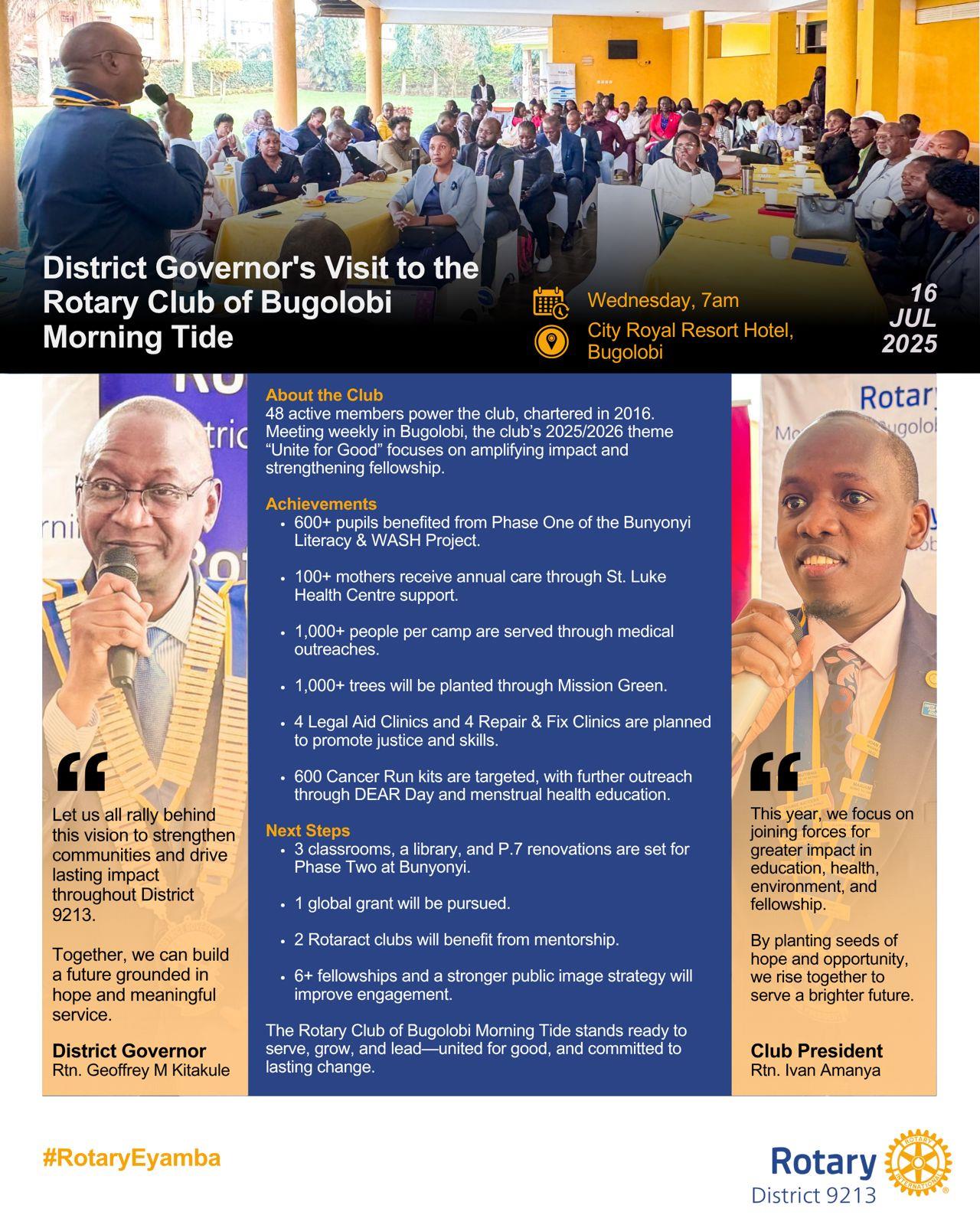 DG Geoffrey Visits RC Bugolobi Morning Tide![]() Over the years, Rotary Club of Bugolobi Morning Tide has: • 📚 Impacted 600+ pupils via literacy & WASH • 🤰 Cared for 100+ mothers annually • 🏥 Served 1,000+ per medical outreach • 🌳 Ready to plant 1,000+ trees • ⚖️ Planning legal aid & repair clinics #RotaryEyamba |