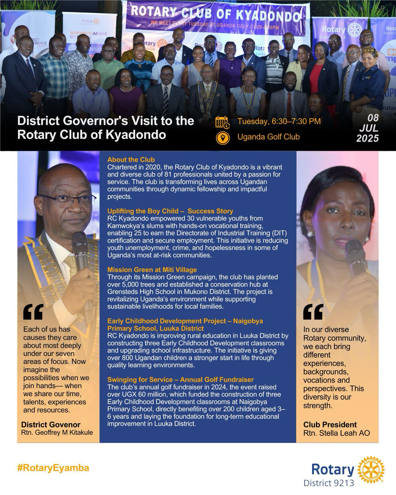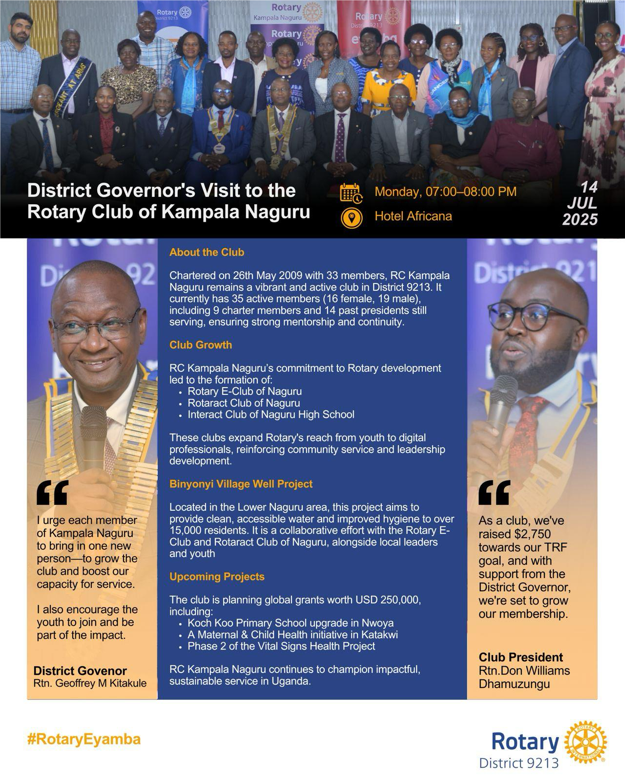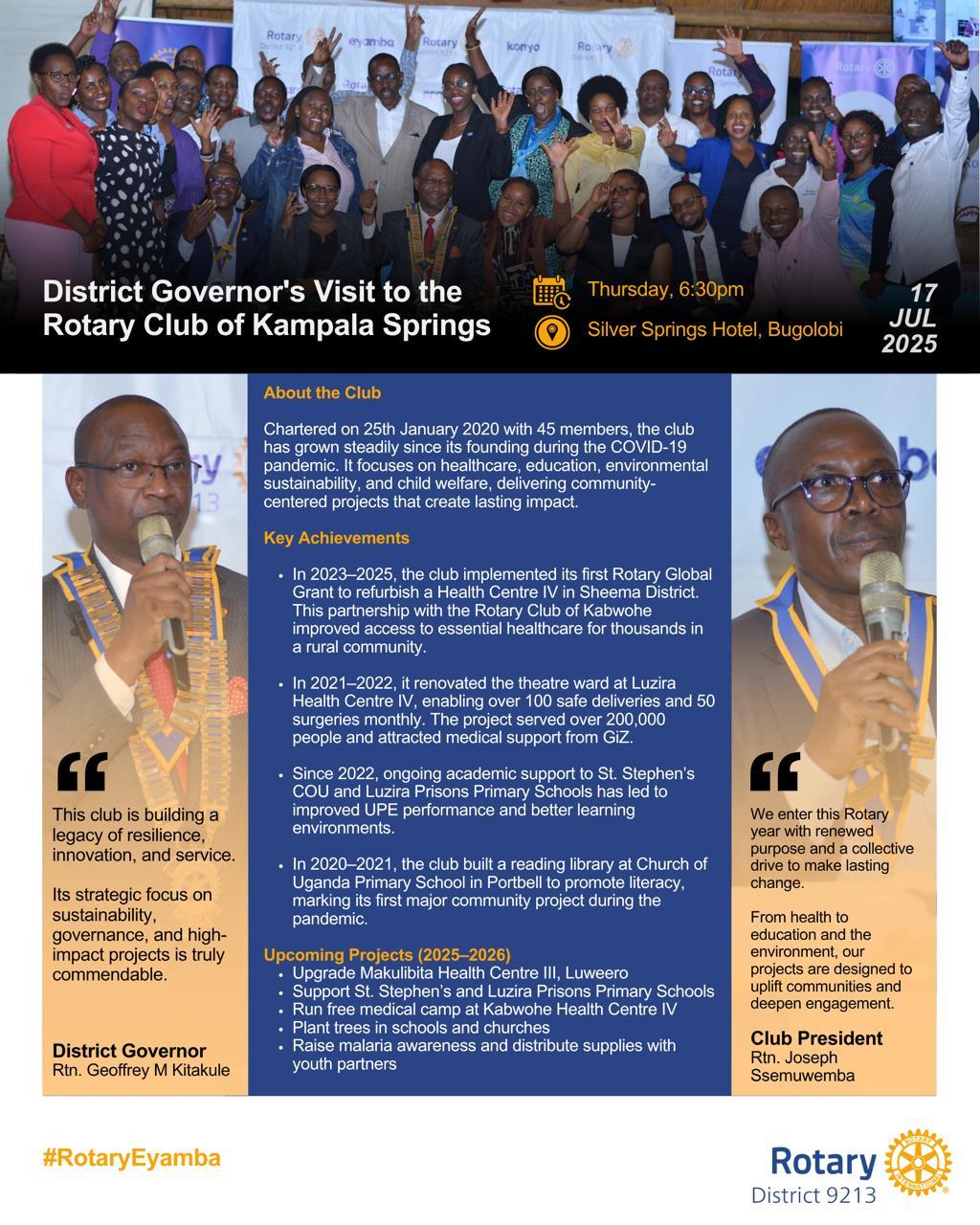 DG Geoffrey Visits RC Kampala Naguru![]() Did you know the Rotary Club of Kampala Naguru is doing the following to improve lives? ✅ Providing clean water to over 15,000 people in Binyonyi Village ✅ Supporting schools, mothers, and children through vital health projects ✅ Empowering youth by mentoring and forming new clubs #RotaryEyamba |