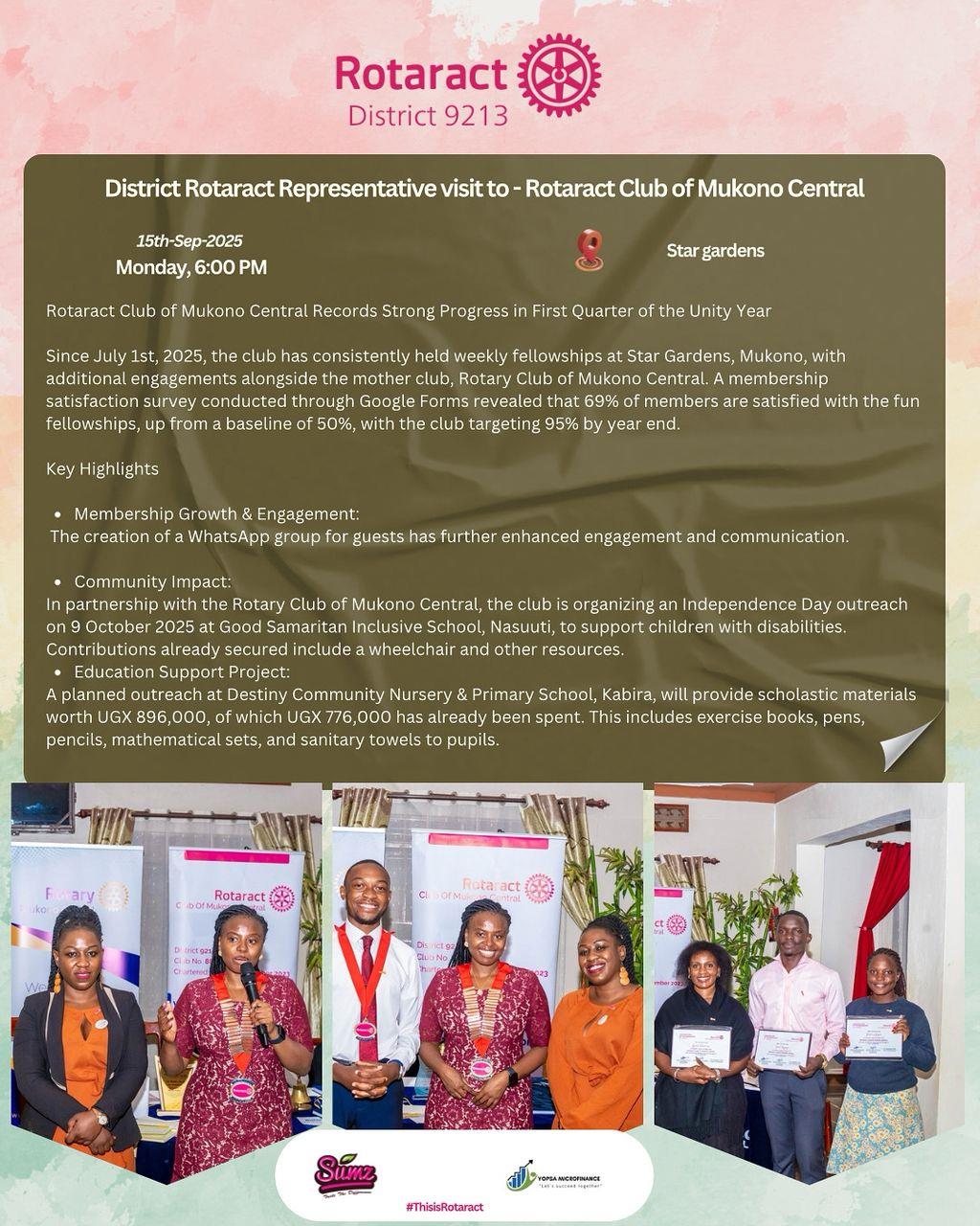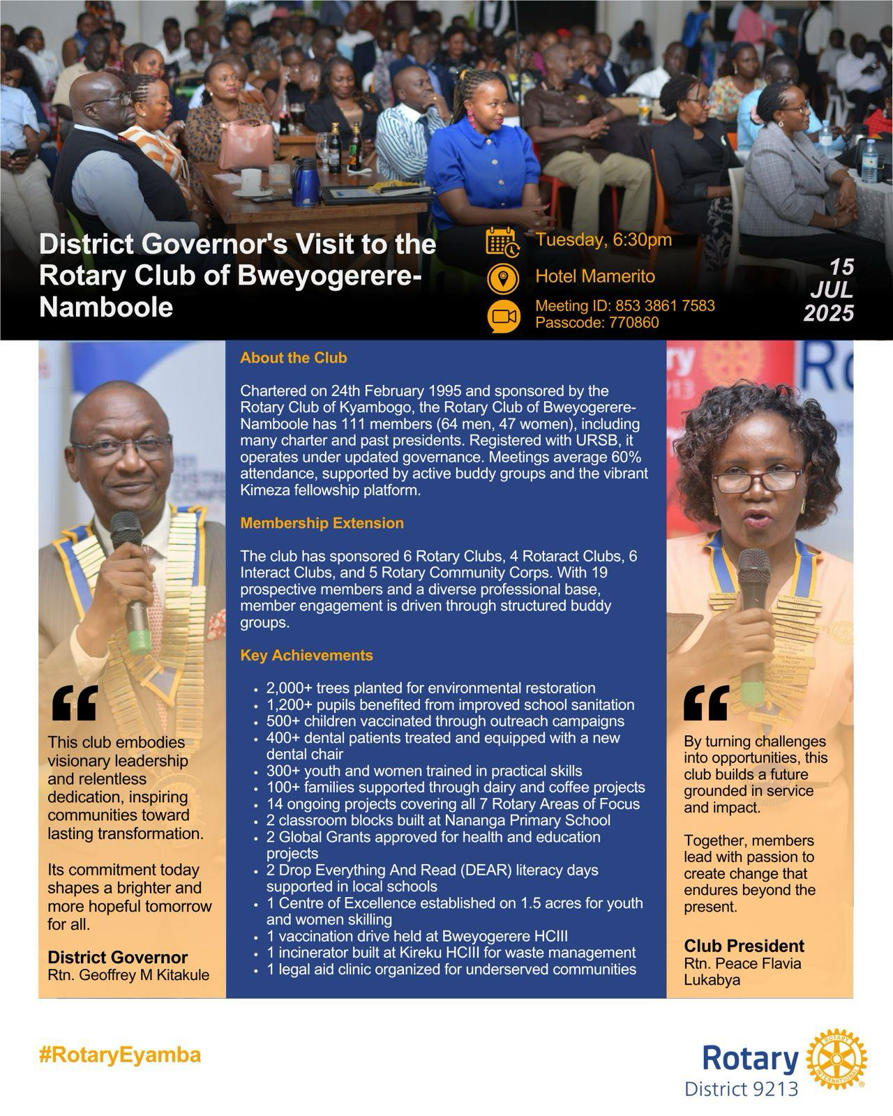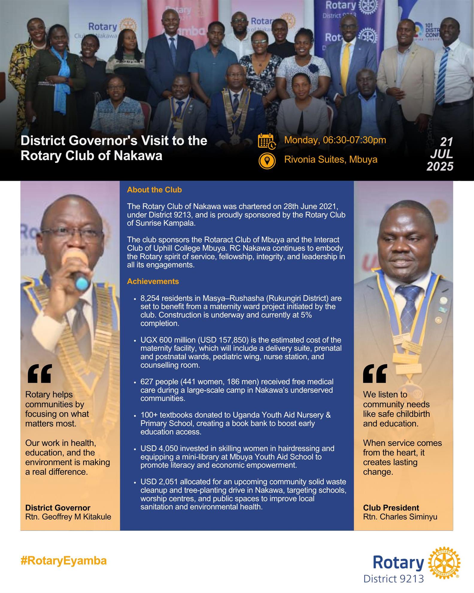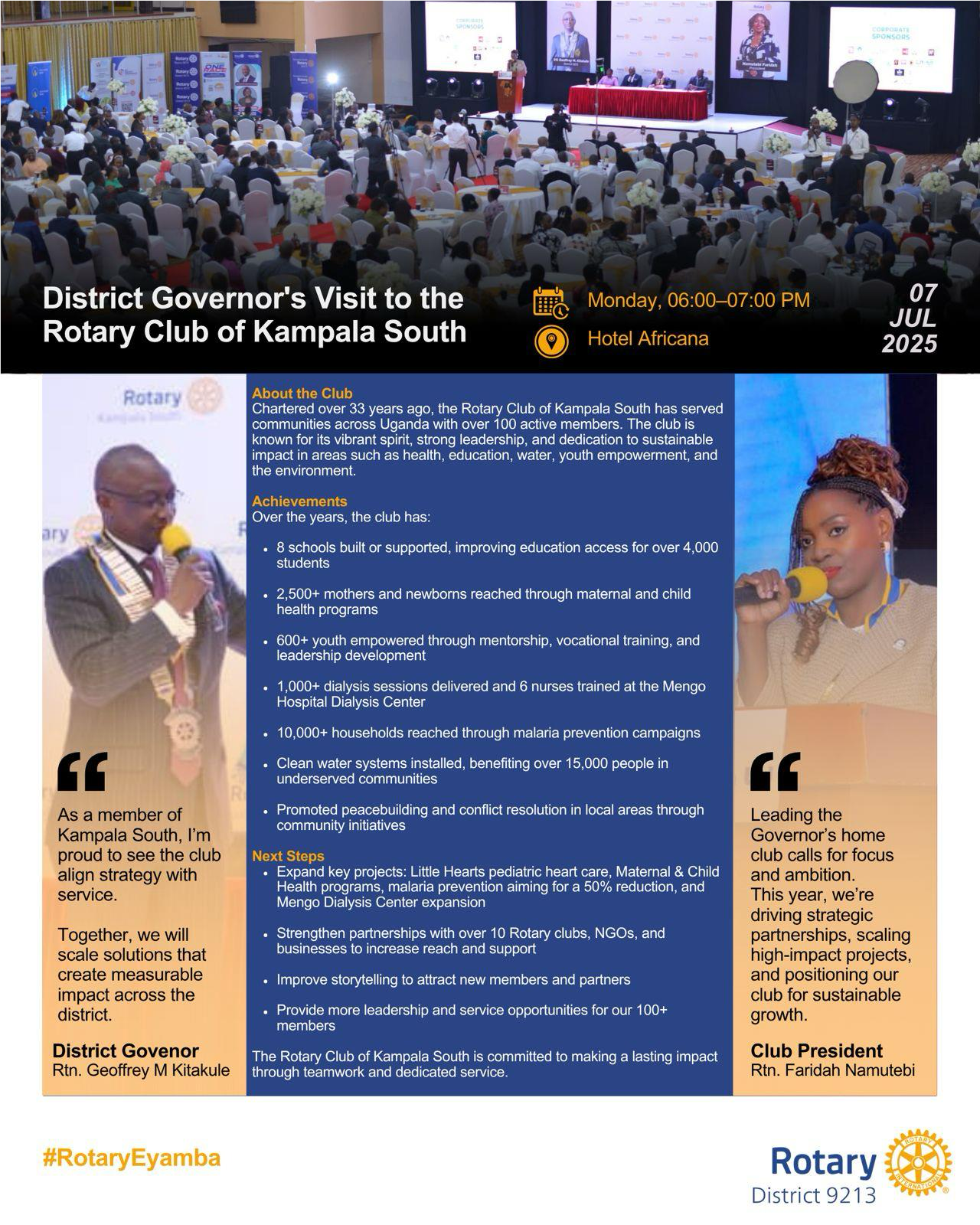 DG Geoffrey Visits RC Kampala Naguru![]() Did you know the Rotary Club of Kampala Naguru is doing the following to improve lives? ✅ Providing clean water to over 15,000 people in Binyonyi Village ✅ Supporting schools, mothers, and children through vital health projects ✅ Empowering youth by mentoring and forming new clubs #RotaryEyamba |