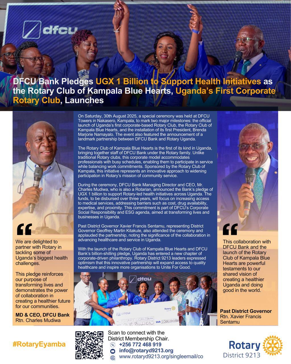 DFCU Bank Pledges UGX 1 Billion to Support Health Initiatives![]() DFCU Bank pledges UGX 1 Billion to support health initiatives as the Rotary Club of Kampala Blue Hearts, Uganda’s first corporate Rotary Club, launches. This pledge will: * 🏥 Improve healthcare access * 🤝 Strengthen communities * 🌍 Inspire organizations to #UniteForGood #RotaryEyamba |