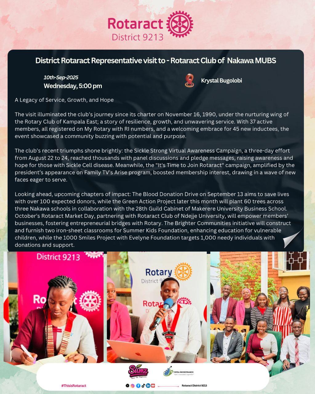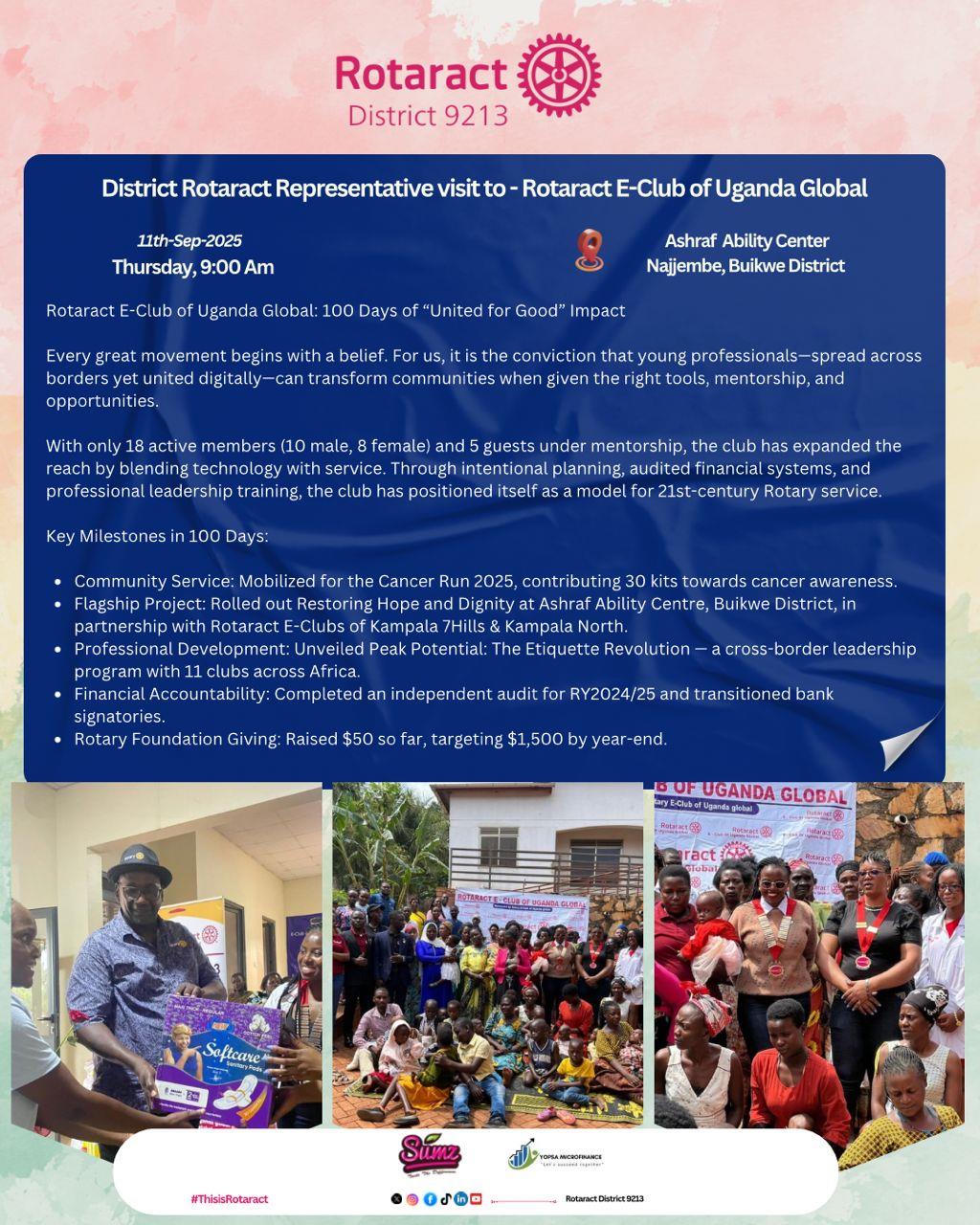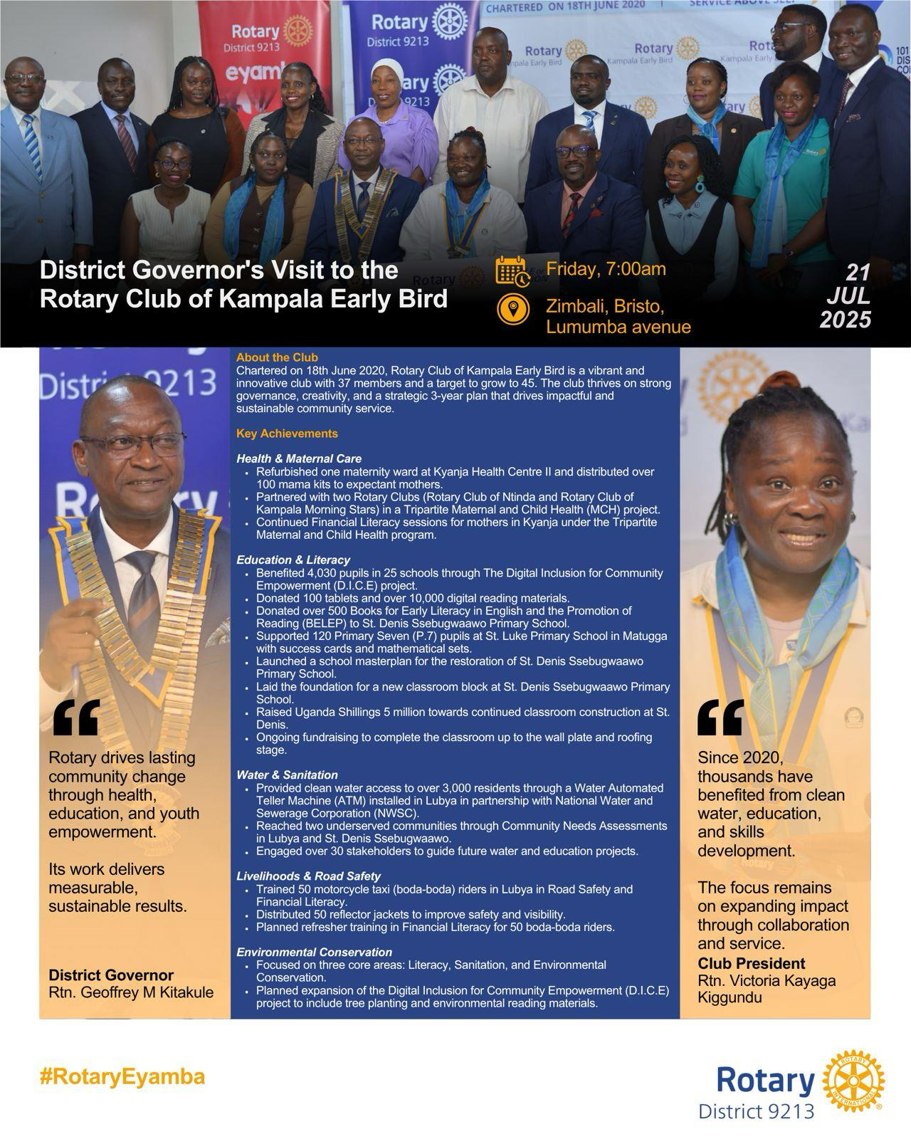 DG Geoffrey Visits RC Kampala Early Bird![]() The Rotary Club of Kampala Early Bird has: 📚 Reached 4,000+ learners with digital tools 💧 Provided clean water to 3,000+ residents 🩺 Delivered 100+ mama kits & refurbished a maternity ward 🛵 Trained 50 boda-boda riders in safety & finance #RotaryEyamba |