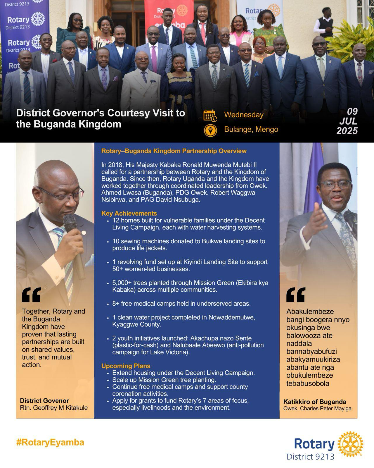 DG Geoffrey Visits Kingdom of Buganda![]() Rotary and the Kingdom of Buganda are working together to deliver impactful service through a growing partnership. ✅ 12 homes built ✅ 10 sewing machines donated ✅ 5,000+ trees planted ✅ 8+ medical camps ✅ Clean water in Kyaggwe ✅ Women & youth empowered #RotaryEyamba |