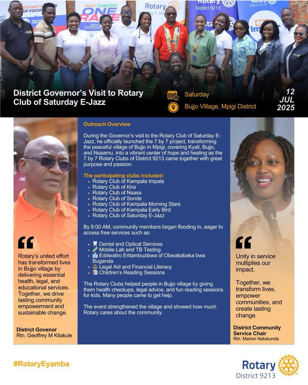 DG Geoffrey Visits RC Saturday E-Jazz![]() During the Governor’s visit to Rotary Club of Saturday E-Jazz, he launched the 7 by 7 project—an initiative by seven Rotary clubs to transform Bujjo village in Mpigi into a center of hope. #RotaryEyamba |