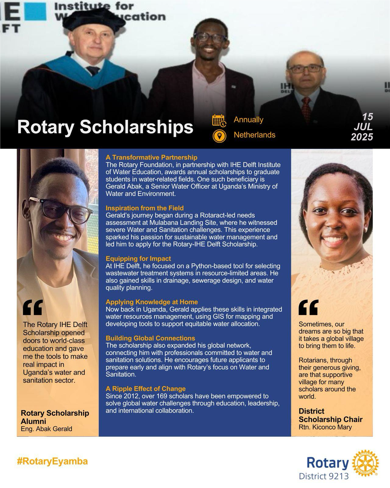Rotary Scholarships![]() The Rotary-IHE Delft Scholarship helps people like Gerald Abak get skills to solve real water problems. He now uses what he learned to improve clean water and sanitation in Uganda. You don’t need to be a Rotarian to apply, just care about clean water! #RotaryEyamba |