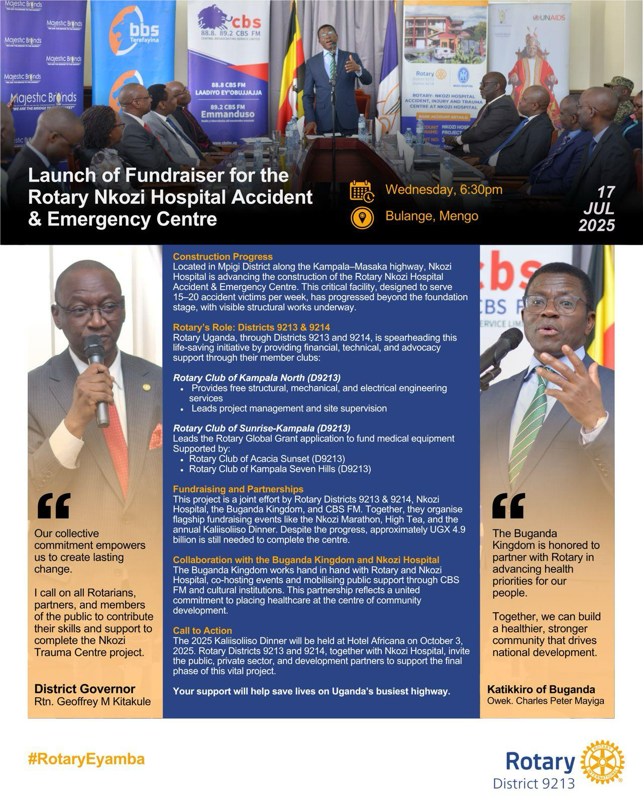 Launch of Fundraiser for the Rotary Nkozi Hospital Accident & Emergency Center![]() Rotary D9213/9214, Nkozi Hospital, Buganda Kingdom & CBS FM are advancing the Rotary Nkozi Hospital Accident & Emergency Centre: 🌟 Foundation & walls done 🌟 Ongoing engineering support 🌟 Rotary Global Grant in progress 🌟 UGX 4.9B still needed Join us Oct 3 at Hotel Africana! #RotaryEyamba |