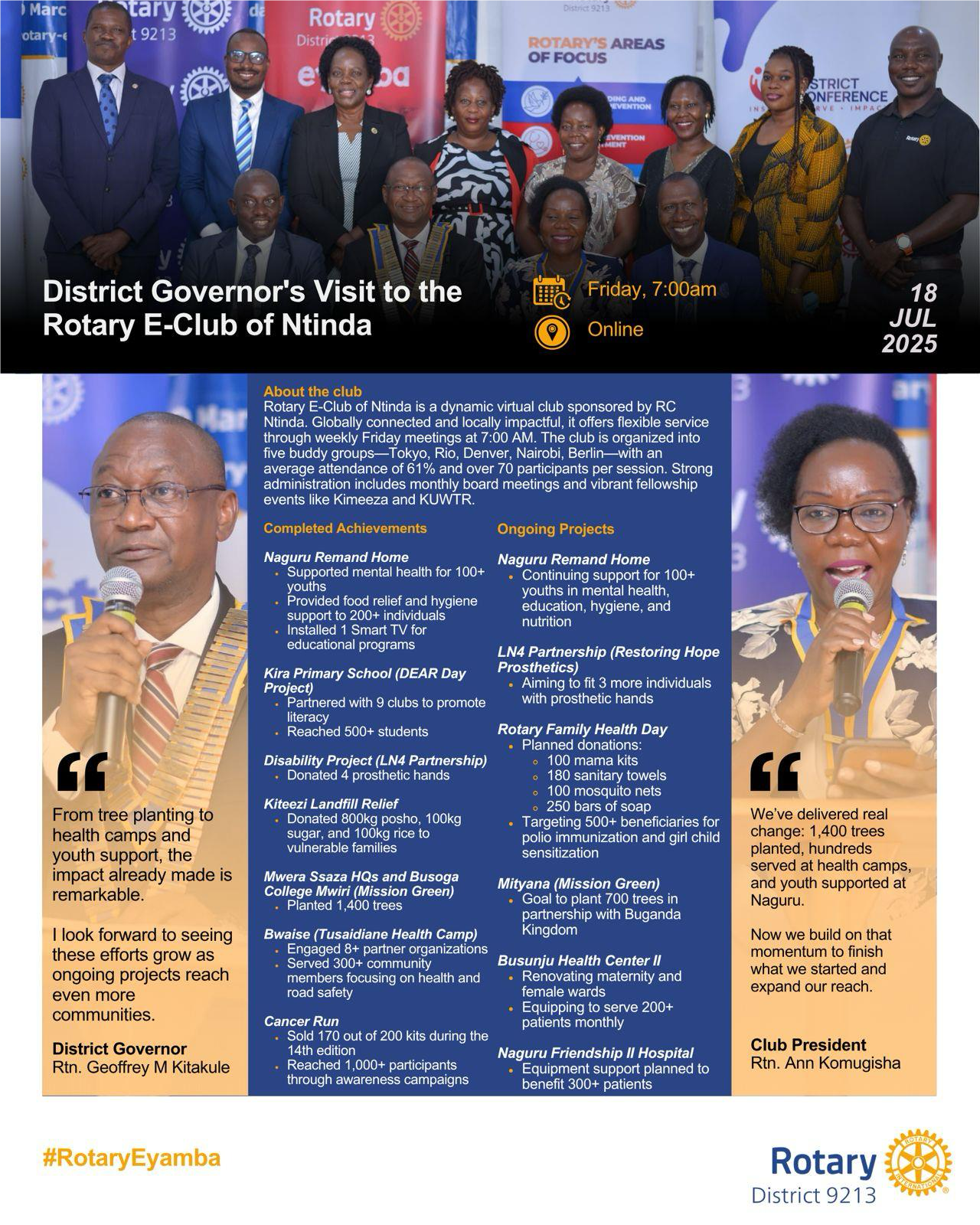 DG Geoffrey Visits Rotary E-Club of Ntinda![]() The impact is clear at the Rotary E-Club of Ntinda: 🌱 1,400 trees planted 📚 500+ students reached 🩺 300+ served at health camp 💪 4 prosthetic hands donated 🧠 Mental health & learning support at Naguru #RotaryEyamba |